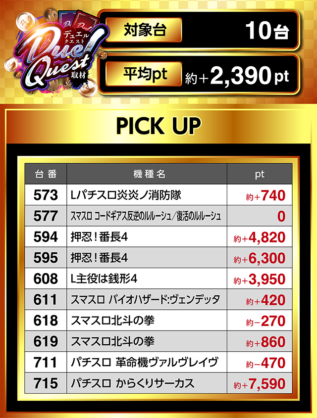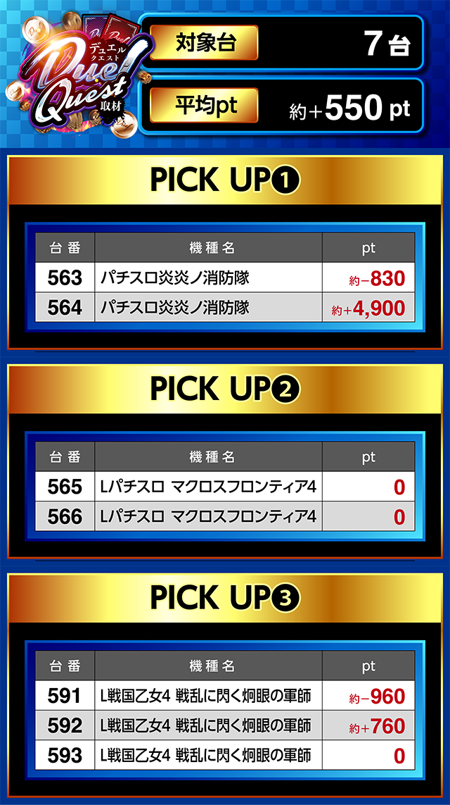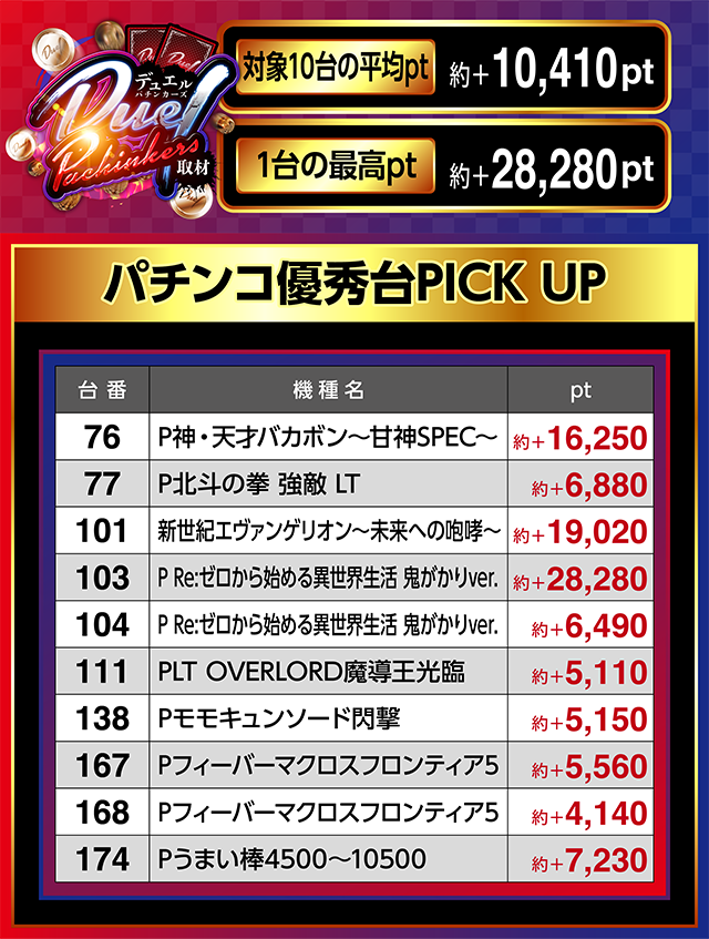 パチスロは「パチスロ炎炎ノ消防隊」や「パチスロ からくりサーカス」などに約+4,000pt以上があり、パチンコは約+16,000pt超を複数台が記録した。