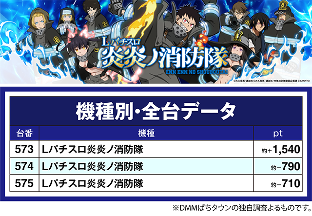 573番台の「Lパチスロ炎炎ノ消防隊」は約+1,500ptを超えた。