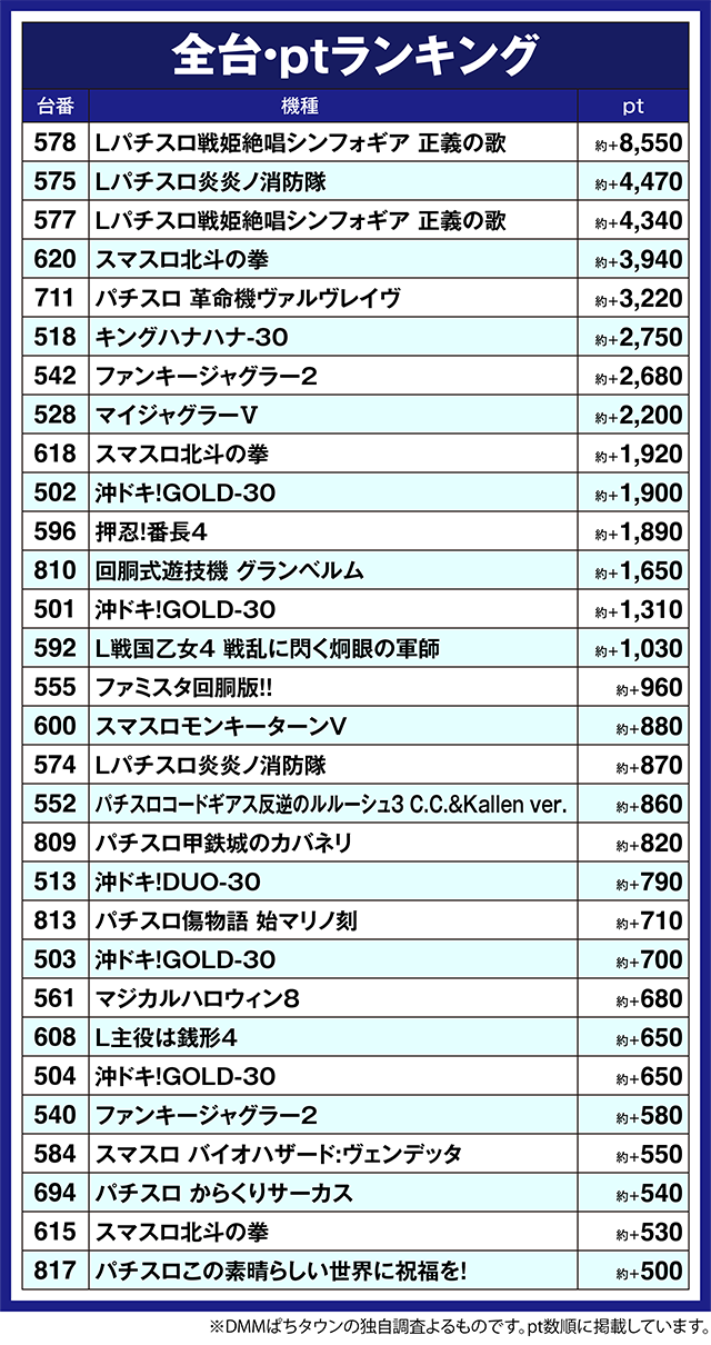 「キングハナハナ-30」の518番台や「ファンキージャグラー2」の542番台なども約+2,000pt以上となった。