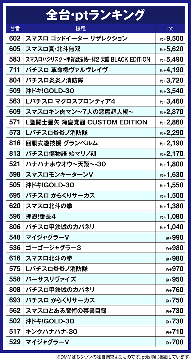 「スマスロ真・北斗無双」の605番台と「スマスロバジリスク~甲賀忍法帖~絆2 天膳 BLACK EDITION」の583番台も約+5,400ptを超えた。