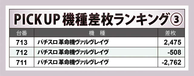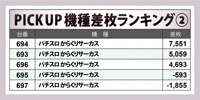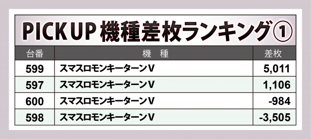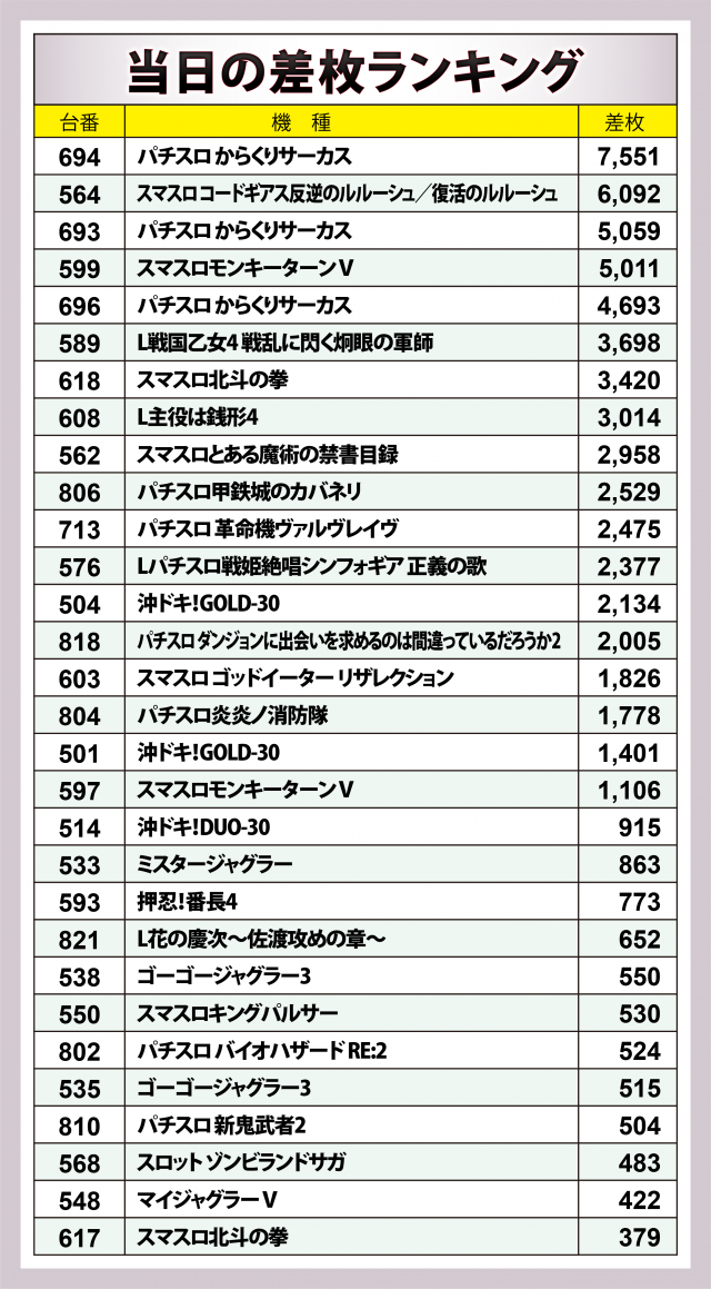 30台の中では18台が4桁のプラスに成功し、+2,000枚以上は14台、+3,000枚以上は8台、+4,000枚オーバーは5台、+5,000枚オーバーは3台、+6,000枚オーバーは2台、+7,000枚オーバーは1台となった。