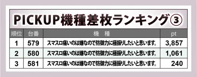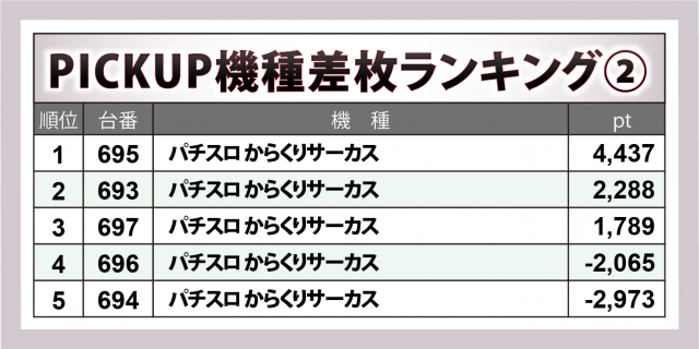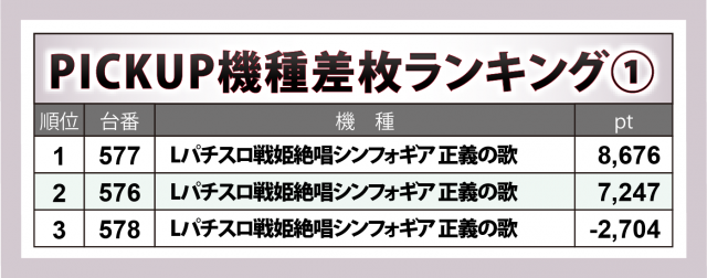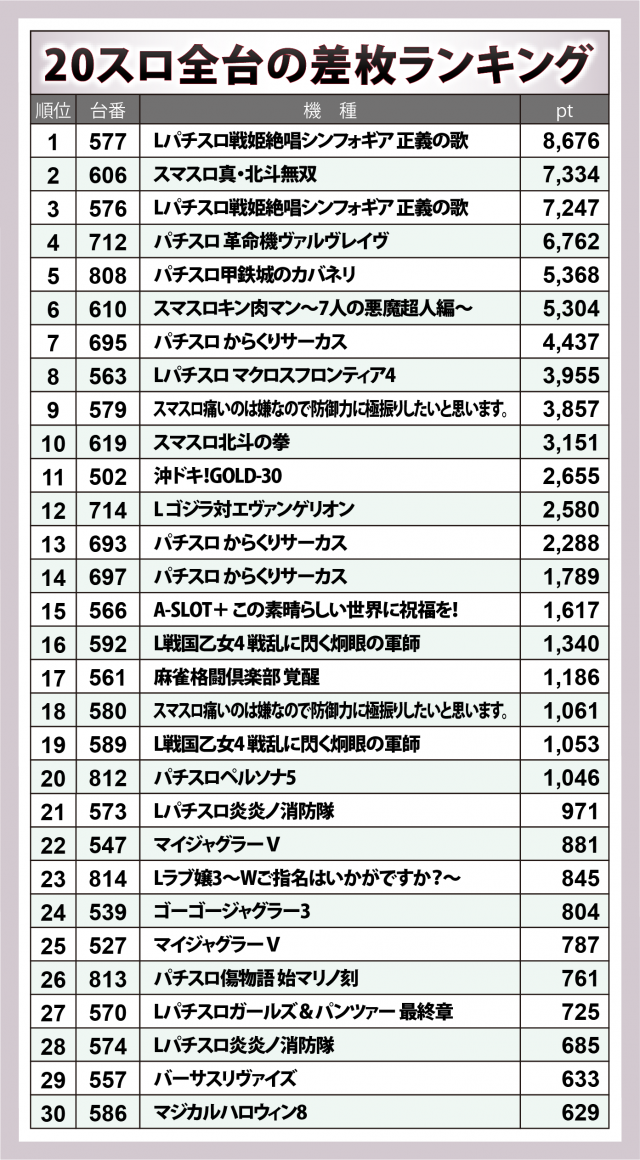 30台のうち20台が4桁のプラスを収め、+2,000枚以上は13台、+3,000枚以上は10台、+4,000枚オーバーは7台、+5,000枚オーバーは6台、+6,000枚オーバーは4台、+7,000枚オーバーは3台、+8,000枚オーバーは1台と、これまでを上回るハイレベルとなった。