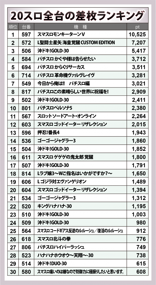 次項で述べる3機種以外のハイスコアとしては、『L聖闘士星矢 海皇覚醒 CUSTOM EDITION』に+7,200枚超、 『パチスロ からくりサーカス』の+3,500枚超、『パチスロ 革命機ヴァルヴレイヴ』の+3,300枚弱、『今日から俺は!! パチスロ編』の+3,000枚超と、様々なスマスロが実力を発揮した。