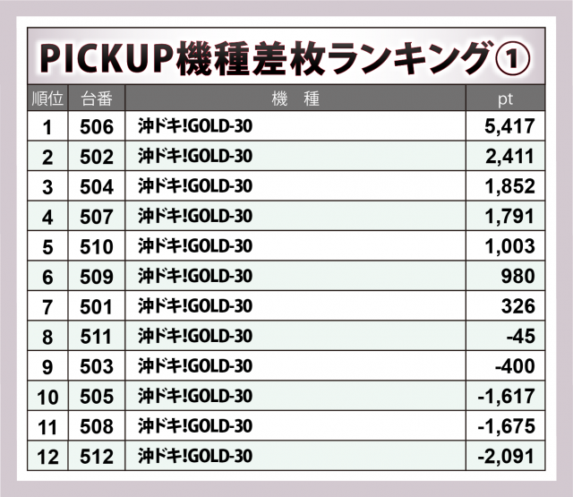 『沖ドキ!GOLD-30』も負けていない。+5,400枚超を筆頭に+2,400枚超×1・+1,000枚オーバー×3と、店内随一の盛り上がりを見せた。