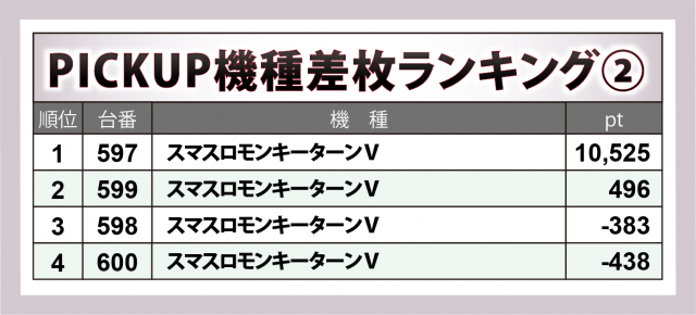 4桁以上のプラスを実現したのが23台、+2,000枚以上は12台、+3,000枚オーバーは7台、+5,000枚オーバーは3台、+7,000枚オーバーは2台、そして万枚をクリアしたのは1台と、ビッグヒットが飛び出した。