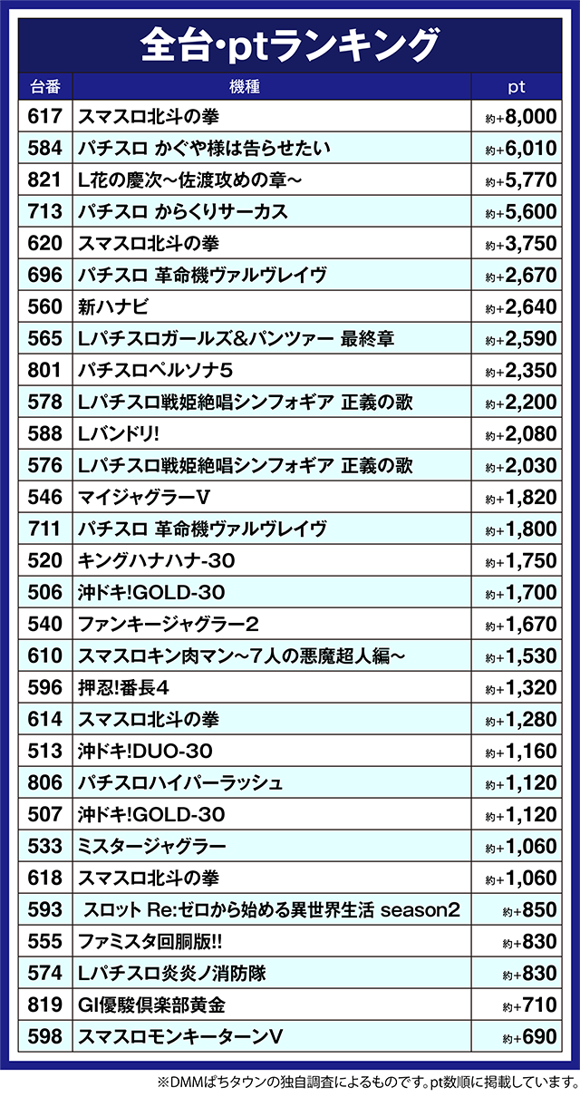 ほかにも、「パチスロ 革命機ヴァルヴレイヴ」の696番台や「新ハナビ」の560番台など、複数台が約+2,000pt以上となった。