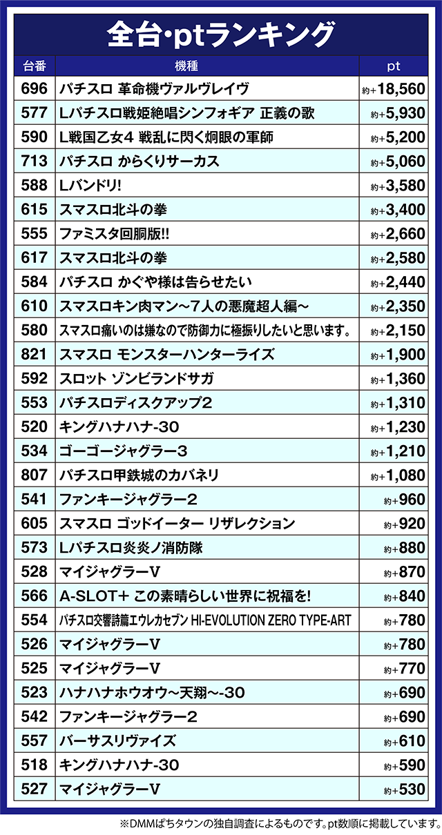ボーナスが軸となる機種も盛況で、「キングハナハナ-30」の520番台と「ゴーゴージャグラー3」の534番台が約+1,200pt以上となった。