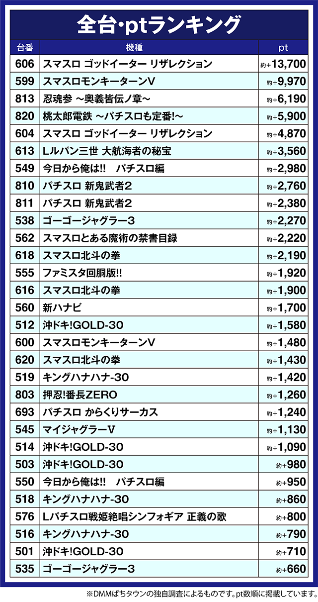 最新機種も盛況で、「桃太郎電鉄 ~パチスロも定番!~」の820番台が約+6,000ptクラス、「Lルパン三世 大航海者の秘宝」の613番台も約+3,500ptを超えた。