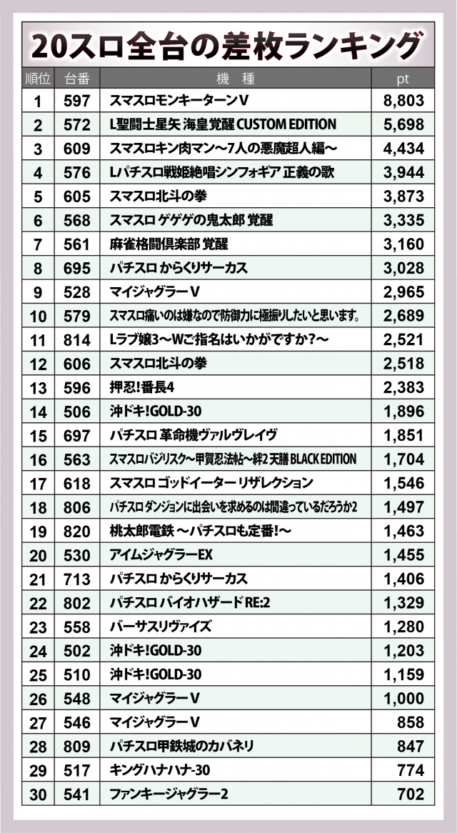 4桁プラスを残したのが26台、+2,000枚以上は13台、+3,000枚オーバーは8台、+4,000枚オーバーは3台、+5,000枚オーバーは2台、+8,000枚オーバーは1台と、万枚をクリアした台こそ見受けられなかったが、いつもと同等のレベルは保っていた。
