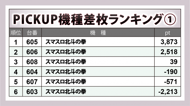 次いで『スマスロ北斗の拳』では+3,900枚弱&+2,500枚超が1台ずつ、『パチスロ からくりサーカス』では+3,000枚超&+1,400枚超が1台ずつと、同店では好調機種の常連にチャンスが感じられた。