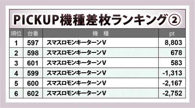 全151台の王座に君臨したのが『スマスロモンキーターンⅤ』597番台で、+8,800枚超の数値をマーク。