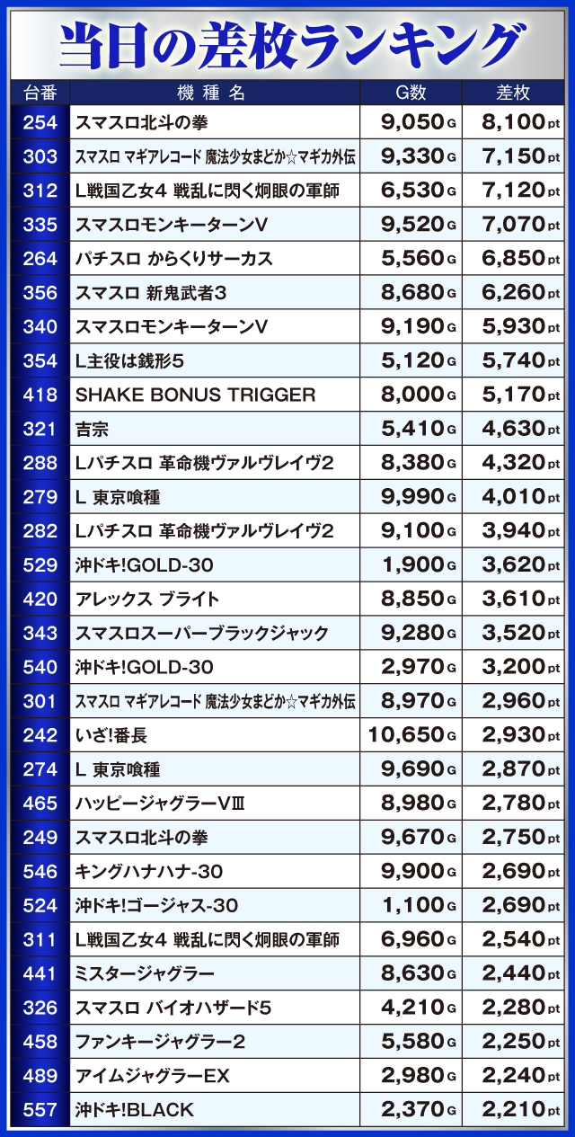 首位に輝いたのは『スマスロ北斗の拳』。254番台が+8,100ptと誰もがうらやむ結果を残した。そして『スマスロ マギアレコード 魔法少女まどか☆マギカ外伝』303番台が+7,150pt、『L戦国乙女4 戦乱に閃く炯眼の軍師』312番台が+7,120pt、『スマスロモンキーターンV』335番台が+7,070ptでつづく。さらに『パチスロ からくりサーカス』264番台の+6,850pt、『スマスロ 新鬼武者3』356番台の+6,260ptなどなど、優秀台がズラリと並ぶ圧巻のランキングができあがっていた。