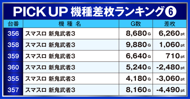 『スマスロ 新鬼武者3』も全台がかなりの高稼働で、とくに356番台がひときわ輝く結果をのこしていた。