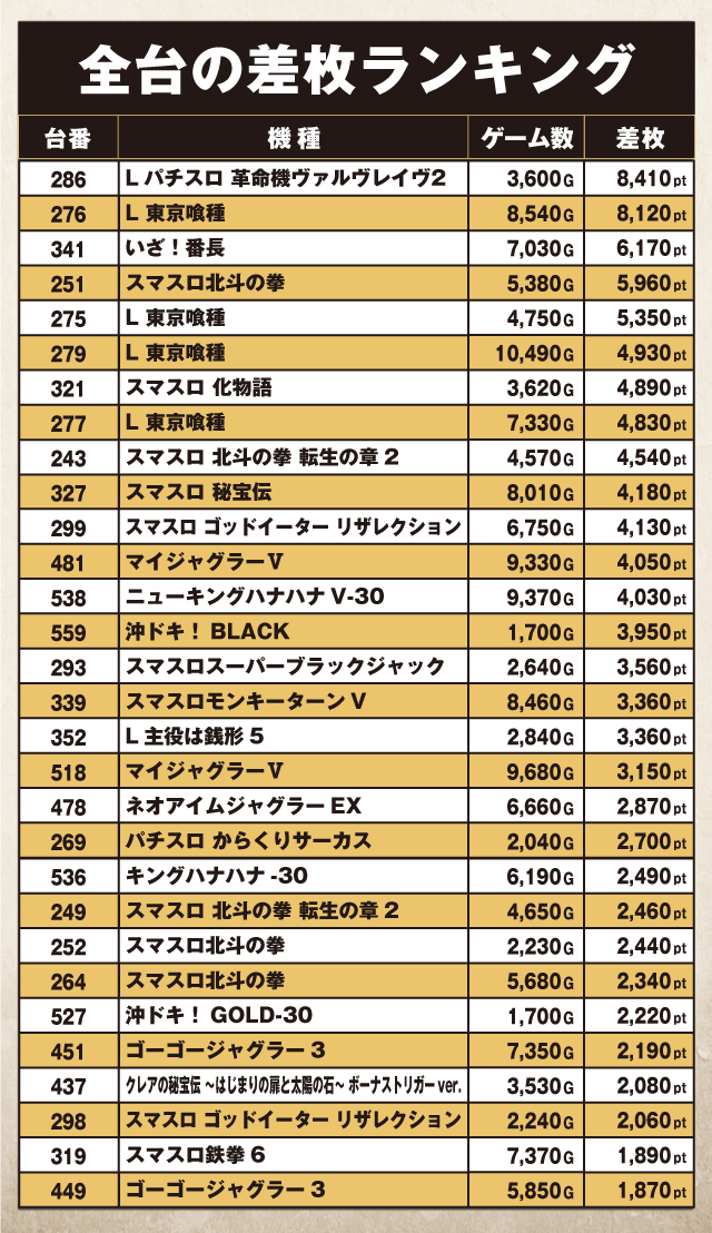 『Lパチスロ 革命機ヴァルヴレイヴ2』286番台が+8,410pt、『L 東京喰種』276番台が+8,120ptと、ハイレベルな首位争いを展開していた。すぐ下には『いざ!番長』341番台が+6,170pt、『スマスロ北斗の拳』251番台が+5,960ptでつづく。さらに『L 東京喰種』275番台の+5,350pt、279番台の+4,930ptといった優秀台が並び、非常に華のあるランキングが完成していた。