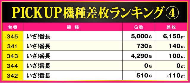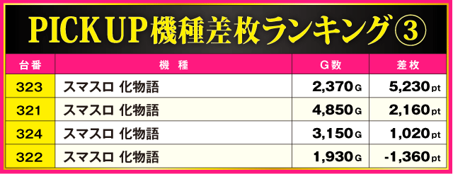 続いてPICK UP機種の状況をチェック!! ランキングを制した『スマスロ 北斗の拳 転生の章2』は全12台中11台がプラス差枚となる圧巻の結果に。さらに、『スマスロ北斗の拳』から+4,000pt超が2台、『スマスロ 化物語』から+5,230pt、『いざ!番長』から+6,150ptが発生しているだけに、ファンにとっては大満足の一日となったはずだ。