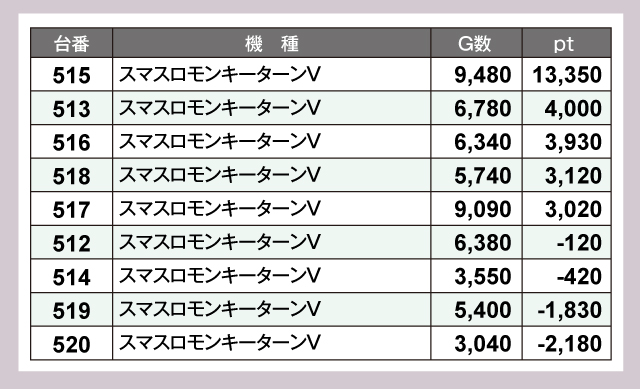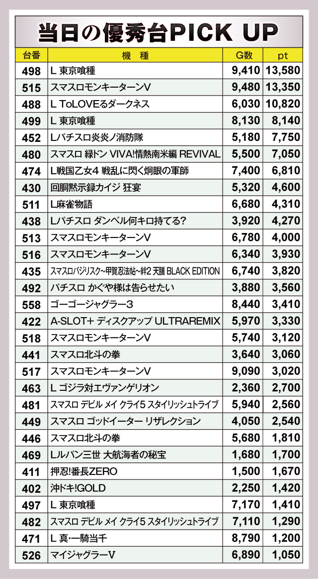 この日、強い輝きを放っていたのは3台。『L 東京喰種』498番台が+13,580pt、『スマスロモンキーターンV』515番台が+13,350pt、『L ToLOVEるダークネス』488番台が+10,820ptと1万ptオーバーを果たしている。そして『L 東京喰種』499番台が+8,140pt、『Lパチスロ炎炎ノ消防隊』452番台が+7,750ptと、優秀台がズラリと並んでいた。