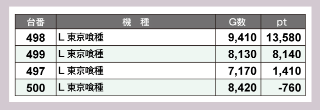 4台設置の『L 東京喰種』は3台がプラスpt。1万pt超えはもちろん8,000pt超えも生まれ、そのポテンシャルを発揮している。