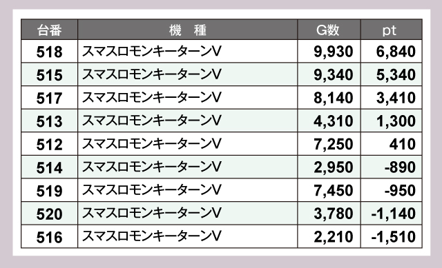 定番の『スマスロモンキーターンV』は9台中5台がプラスpt。全体的に稼働が高く、ptの面でもかなりの優秀台が誕生していた。