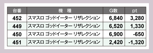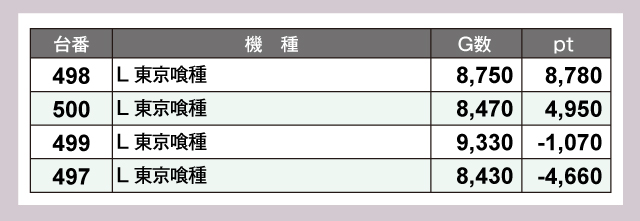 4台設置の『L 東京喰種』と『スマスロ ゴッドイーター リザレクション』はどちらも半数の台がプラスptで、とくに『L 東京喰種』は全台が高稼働。現在の人気ぶりを発揮している。