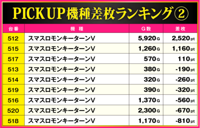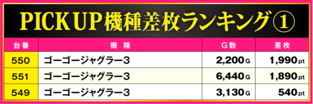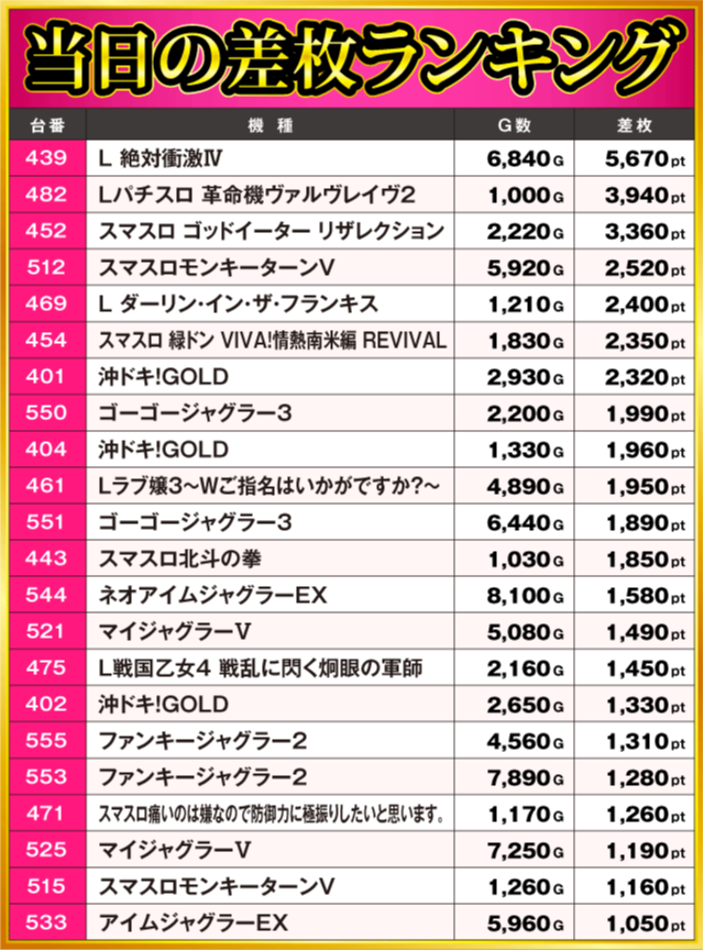 この日は、『L 絶対衝激Ⅳ』が+5,670ptを叩き出しランキングトップに。次いで『Lパチスロ 革命機ヴァルヴレイヴ2』と『スマスロ ゴッドイーター リザレクション』が+3,000pt超を記録し店内を盛り上げていた。また、人気のジャグラーシリーズも奮闘しており、『ゴーゴージャグラー3』をはじめ複数の機種がランキングに名を連ねている。