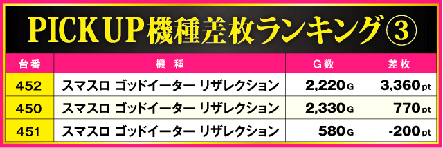 次にPICK UP機種の状況をチェックしていくと、『ゴーゴージャグラー3』は設置されている3台全てがプラス差枚に。さらに、『スマスロモンキーターンV』からは+2,520pt、『スマスロ ゴッドイーター リザレクション』からは+3,360ptが発生しており、それぞれのシマは常に活気とファンの笑顔に包まれる一日となった。