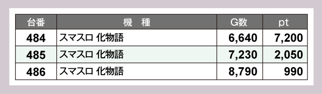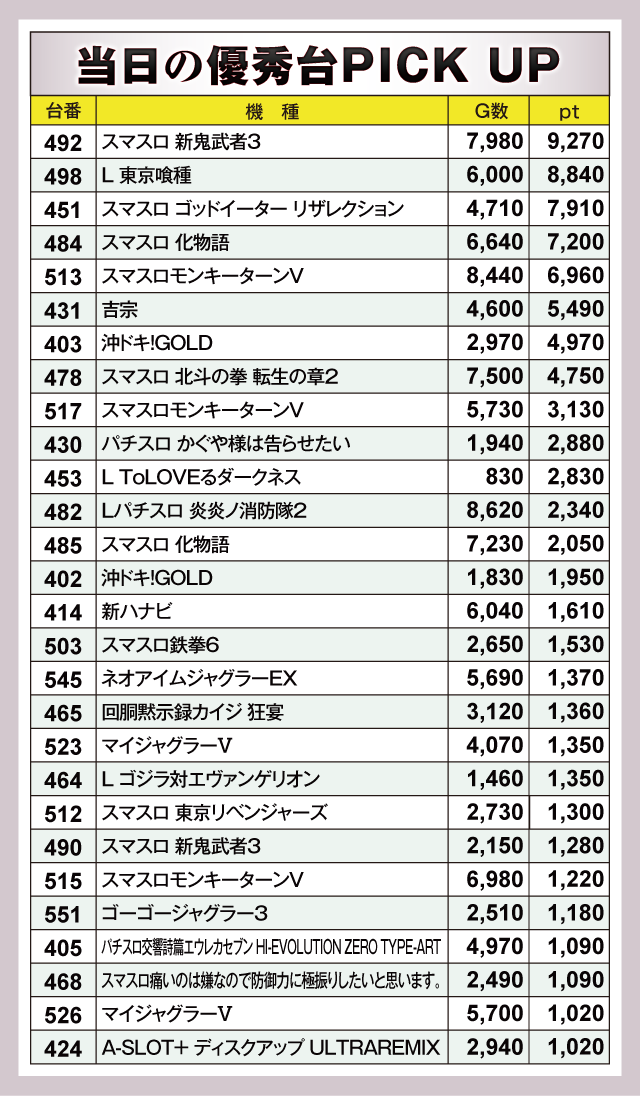 『スマスロ 新鬼武者3』492番台が+9,270ptでデータ最上部に輝き、『L 東京喰種』498番台が+8,840ptでそれにつづいていた。さらに『スマスロ ゴッドイーター リザレクション』451番台が+7,910pt、『スマスロ 化物語』484番台が+7,200ptで並ぶ。以下『スマスロモンキーターンV』513番台の+6,960ptなどなど、ファン垂涎のptがズラリと連なる豪華なデータとなっていた。