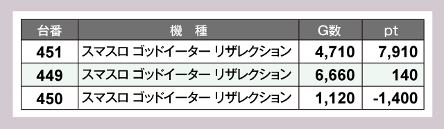 『スマスロ ゴッドイーター リザレクション』は7,000ptオーバーが飛びだすなど、定番人気機種としての実力をアピールしていた。
