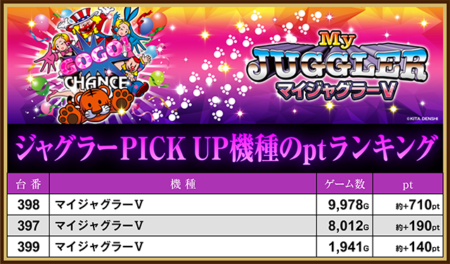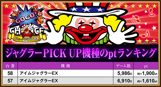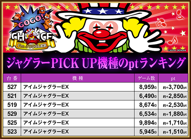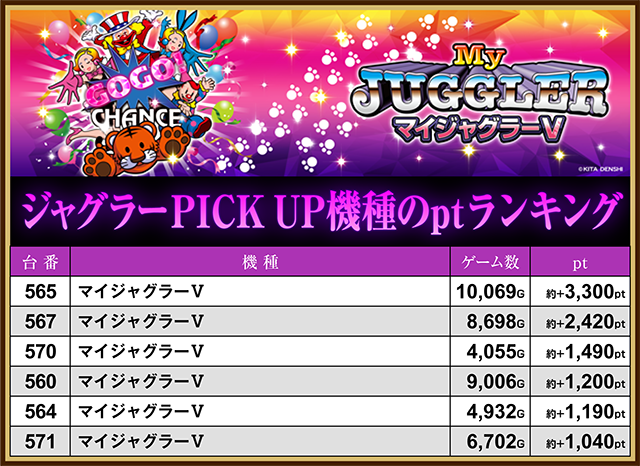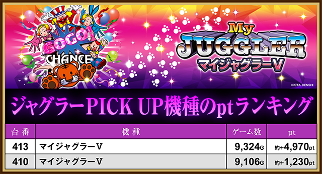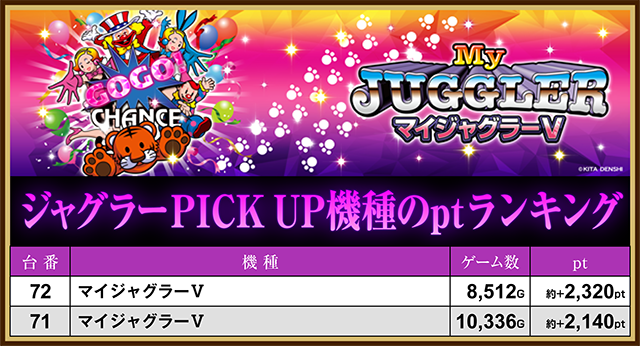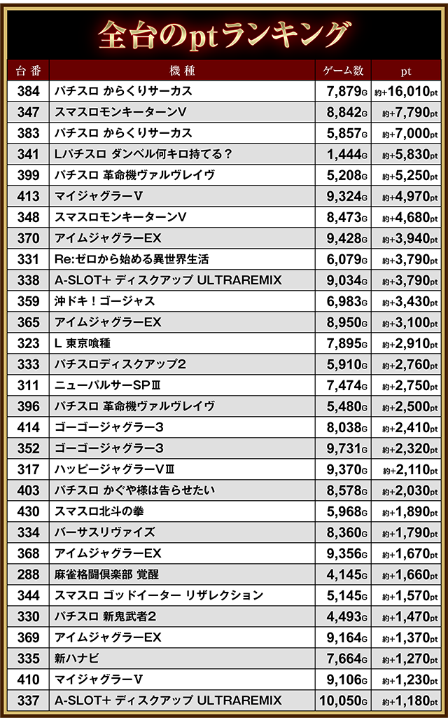 また、「ミスタージャグラー」の559番台も約+4,670ptとなった。