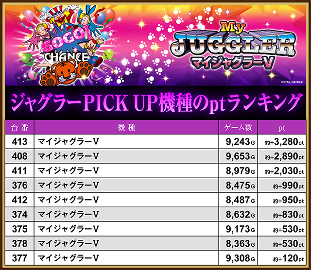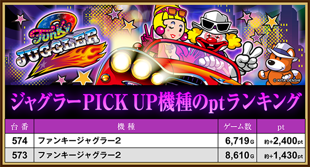 また、「ファンキージャグラー2」でも404番台が約+2,220pt、「ゴーゴージャグラー3」の391番台もプラスとなった。
