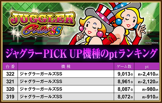 「ジャグラーガールズSS」の322番台と321番台も約+2,100ptを上回った。