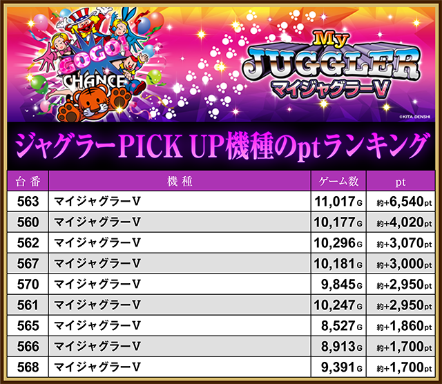 「パチンコプラザ袖師」では、「マイジャグラーⅤ」の563番台が約+6,540pt。