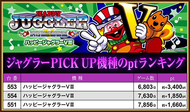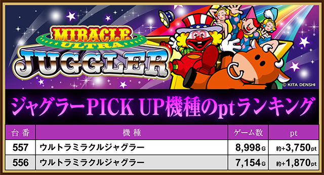 「アイムジャグラーEX」や「ハッピージャグラーVⅢ」、「ウルトラミラクルジャグラー」も複数台が約+1,400ptオーバー。