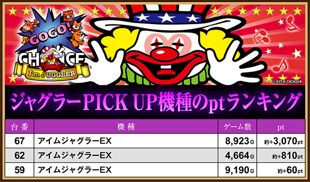 「パチンコプラザ大手店」においては、「アイムジャグラーEX」の67番台が約+3,070pt。