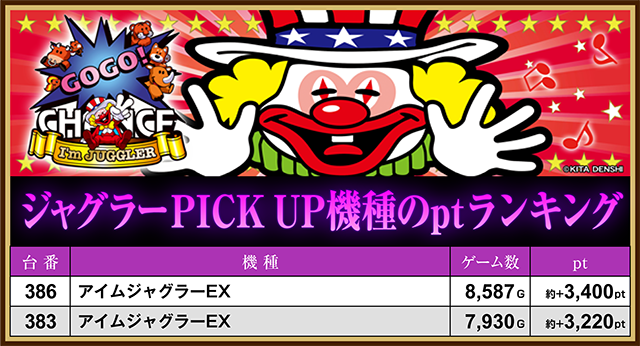 「アイムジャグラーEX」では、386番台と383番台が約+3,200ptを上回った。