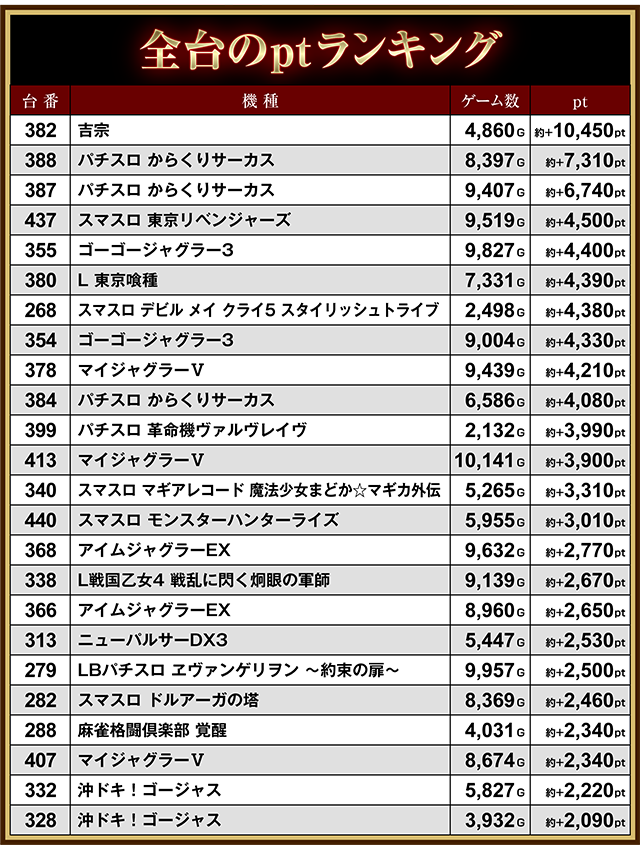 「ゴーゴージャグラー3」の355番台や「L 東京喰種」の380番台なども約+4,000pt以上となった。