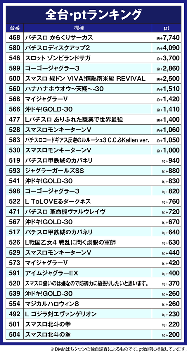 1台設置の機種も活気があり、「パチスロディスクアップ2」が約+4,090pt、「スロット ゾンビランドサガ」も約+3,700otを記録した。