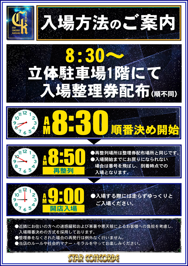 【8:30】入場整理券(順不動)配布 → 【8:50】再整列 → 【9:00】入場開始 |