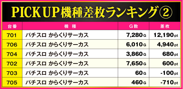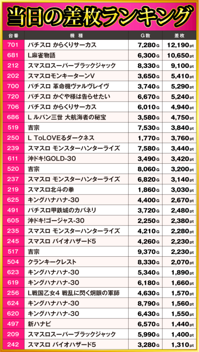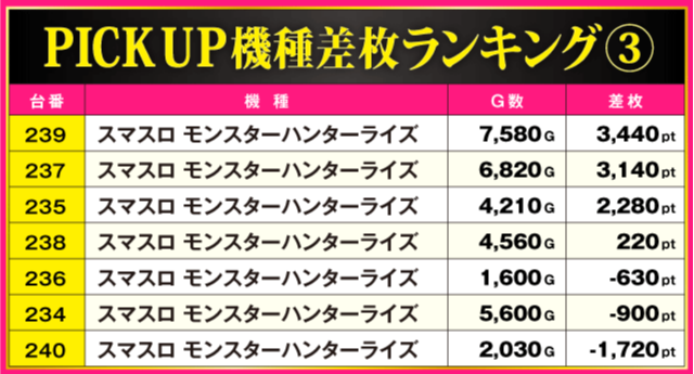 今回のPICK UP機種は3機種。『スマスロスーパーブラックジャック』は212番台が+9,100ptを記録、万枚超を達成した『パチスロ からくりサーカス』は他の台からも+4,940ptといった好成績が飛び出している。さらに、『スマスロ モンスターハンターライズ』は全7台中4台がプラス差枚となる見事な結果を残した。