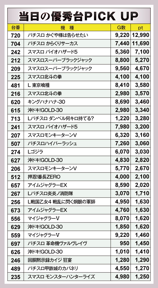 この日は『パチスロ かぐや様は告らせたい』720番台と『パチスロ からくりサーカス』704番台が1万ptオーバーを達成!次いで『スマスロ バイオハザード5』や『スマスロスーパーブラックジャック』などが+5,000ptオーバーと素晴らしい結果を残している。