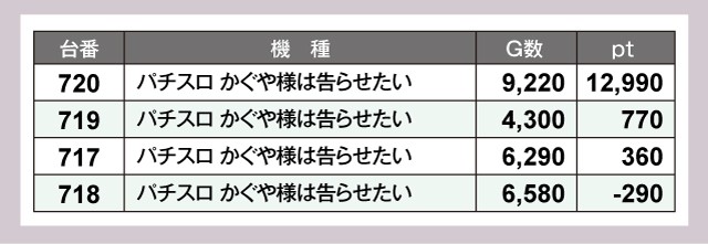 続いては優秀機種を見てみよう。『パチスロ かぐや様は告らせたい』は720番台が+12,990ptと見事なパフォーマンスを披露し、見事ランキング1位に輝いた。