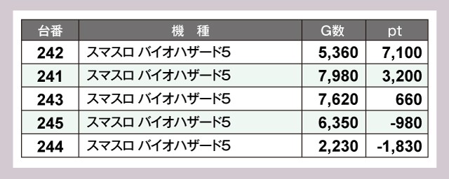 『スマスロ バイオハザード5』では5台中3台がプラスで、242番台が+7,000ptを超えていた。