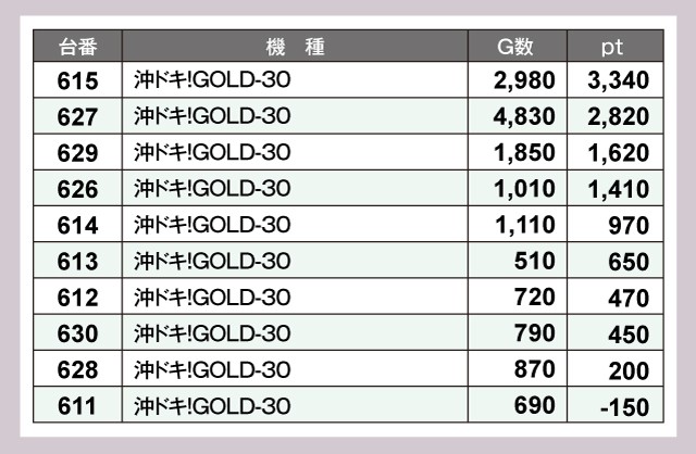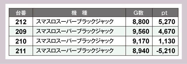 さらに『スマスロスーパーブラックジャック』や『沖ドキ!GOLD-30』も活況。4桁ptを超える優秀台が複数見られた。