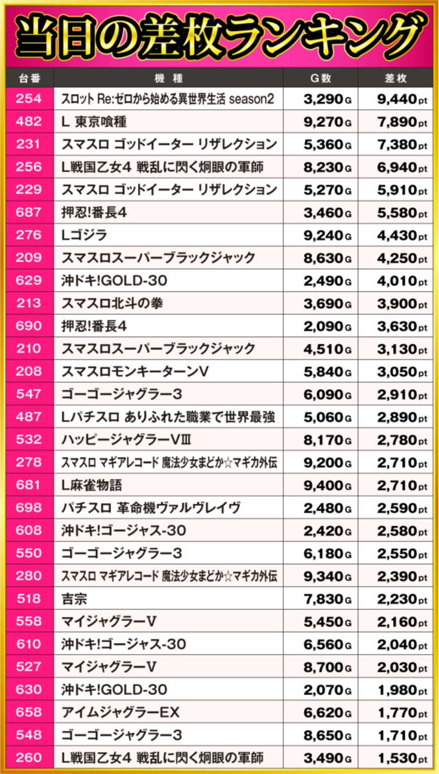 この日は、人気のスマスロを中心に多数のハイスコアが発生。そんな中、『スロット Re:ゼロから始める異世界生活 season2』が+9,440ptを叩き出しランキングトップに。次いで『L 東京喰種』と『スマスロ ゴッドイーター リザレクション』から+7,000pt超が飛び出す盛況ぶりを見せていた。