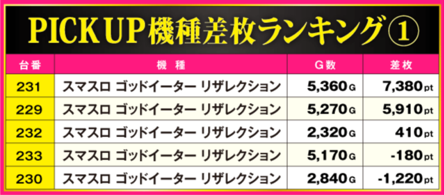 続いてPICK UP機種の状況をチェック!! 『スマスロ ゴッドイーター リザレクション』は+7,000pt超以外に+5,000pt超も確認されている。また、『スマスロスーパーブラックジャック』は209番台が+4,250ptを記録。さらに、2台設置の『Lパチスロ ありふれた職業で世界最強』は、そのどちらもがプラス差枚となる見事な結果を残した。