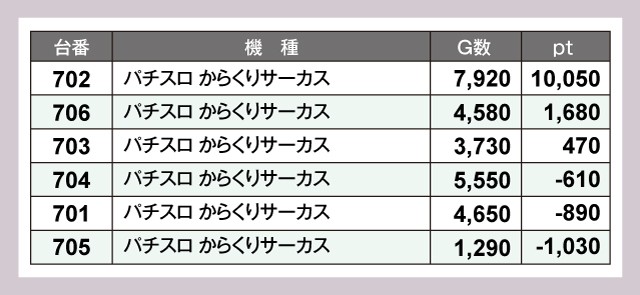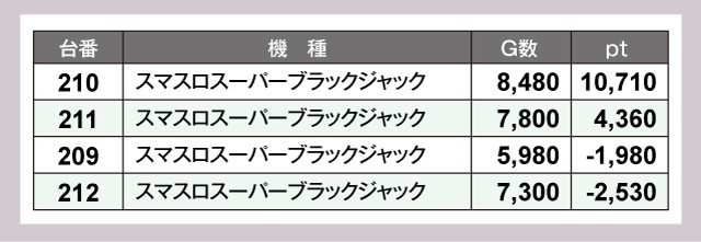 この日は『スマスロ 緑ドン VIVA!情熱南米編 REVIVAL』482番台、『スマスロスーパーブラックジャック』210番台、『パチスロ からくりサーカス』702番台の計3台が+1万ptを超える好記録をマークした。