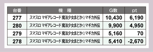 『スマスロ マギアレコード 魔法少女まどか☆マギカ外伝』も活況で、+6,000pt・+4,000ptを超える優秀台が誕生していた。