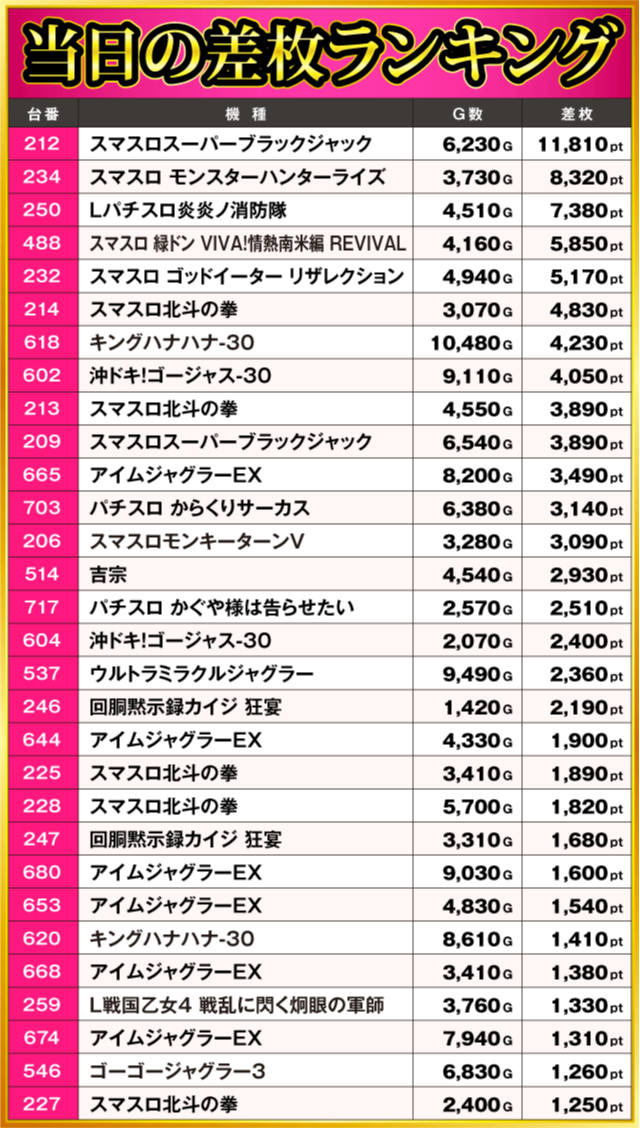 当日の差枚ランキング