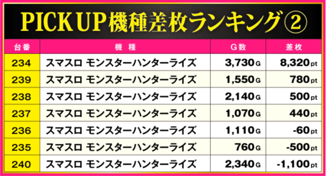 この日は、人気のスマスロを中心に多数の好調台を確認。そんな中、『スマスロスーパーブラックジャック』が万枚超の+11,810ptを叩き出しランキングトップに。次いで『スマスロ モンスターハンターライズ』から+8,320pt、『Lパチスロ炎炎ノ消防隊』から+7,380ptといったハイスコアが発生している。