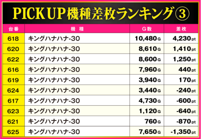 今回のPICK UP機種は全3機種。ランキング上位機種以外で目立っていたのが『キングハナハナ-30』で、618番台が+4,230ptを記録。さらに、3機種とも半数以上の台がプラス差枚で実戦を終えているだけに、それぞれのシマは常に活気に満ち溢れる一日となっていた。