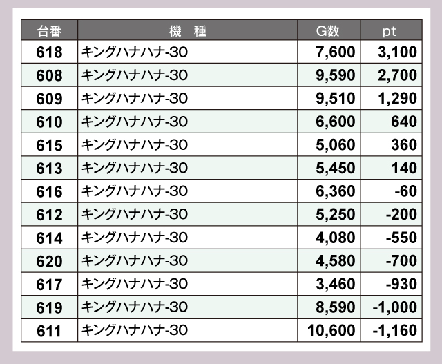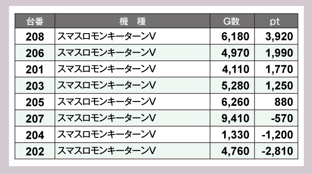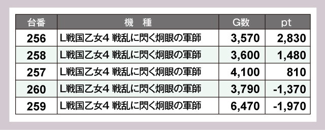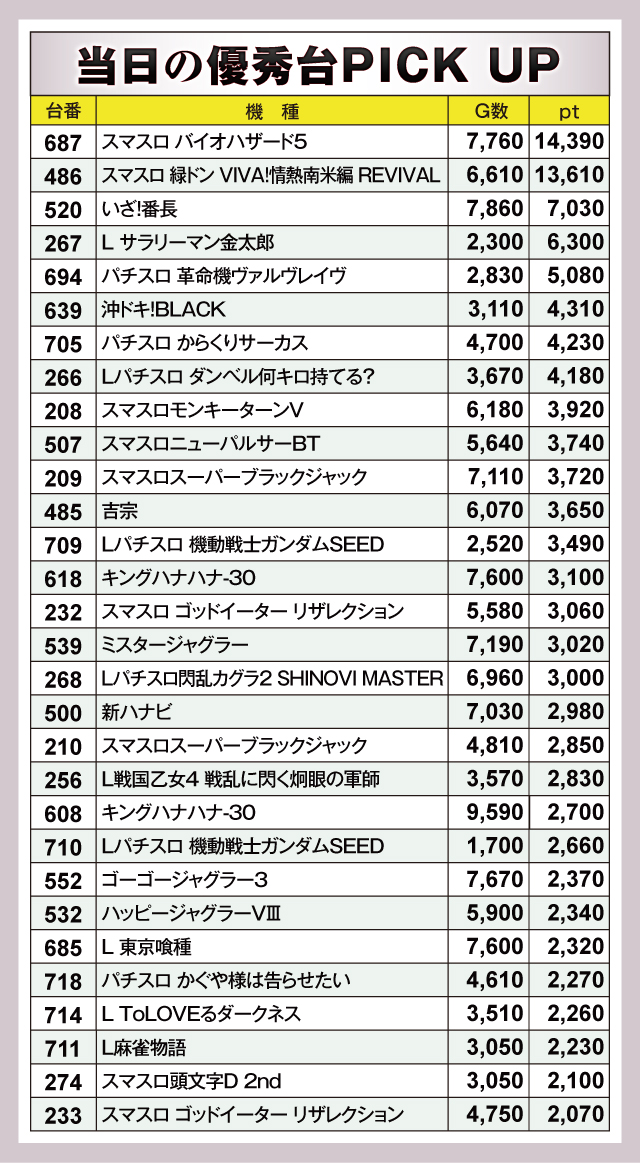 ひときわ目立っていたのは2台。『スマスロ バイオハザード5』687番台が+14,390pt、『スマスロ 緑ドン VIVA!情熱南米編 REVIVAL』486番台が+13,610ptと、1万ptオーバーのハイレベルな結果が並んでいる。次いで『いざ!番長』520番台が+7,030pt、『L サラリーマン金太郎』267番台が+6,300ptなどなど、プレイヤー大満足の優秀台が続出していた。